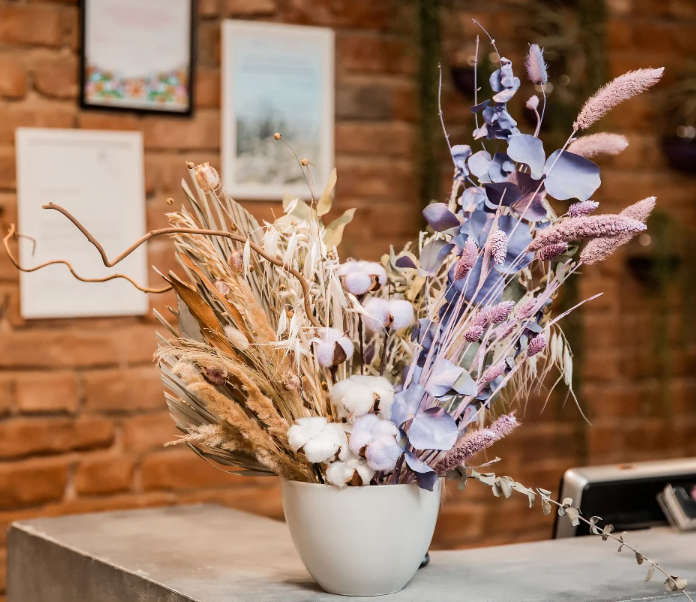 A dramatic arrangement of lilies in warm sunset colors like orange and yellow.